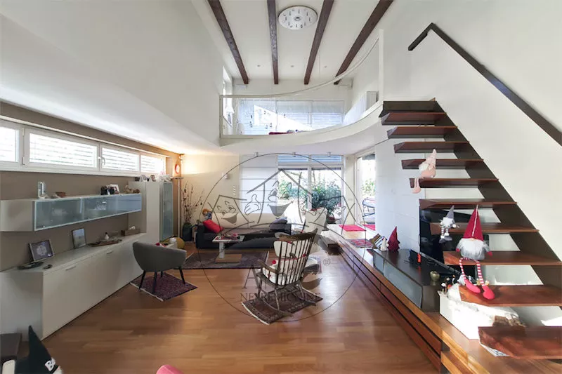 predsoba (čakalnica), kopalnica s tušem in WC-jem, prostorna dnevne soba z galerijo in izhodom na teraso in vrt.